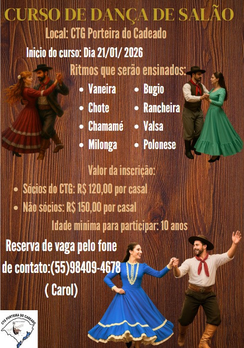 Curso de dança CTG Porteira do Cadeado 21 Jan - 2026 · 00:20 > 21 Fev - 2026 · 00:22 CTG Porteira do Cadeado Curso de dança (Foto: Reprodução)