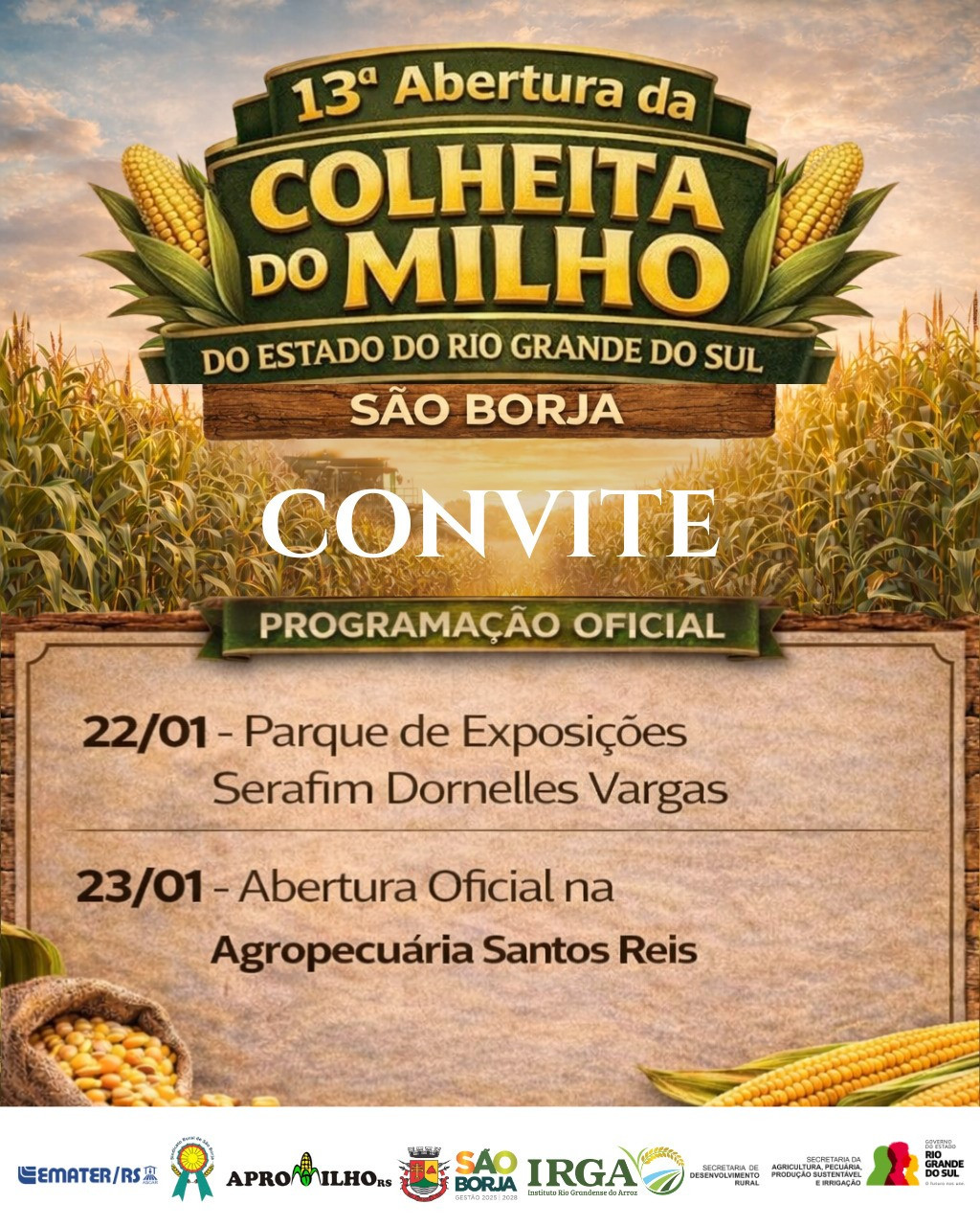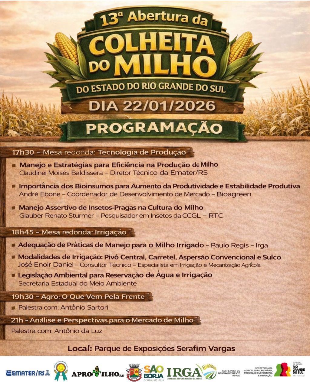 O governador Eduardo Leite participa, na sexta-feira (23/1), às 11h, da 13ª Abertura da Colheita do Milho do Rio Grande do Sul, no Parque de Exposições Serafim Dornelles Vargas, em São Borja. Além de marcar o início oficial da colheita, o evento, que se estende por dois dias, reúne autoridades, produtores rurais, técnicos, pesquisadores e representantes de entidades ligadas ao agronegócio.