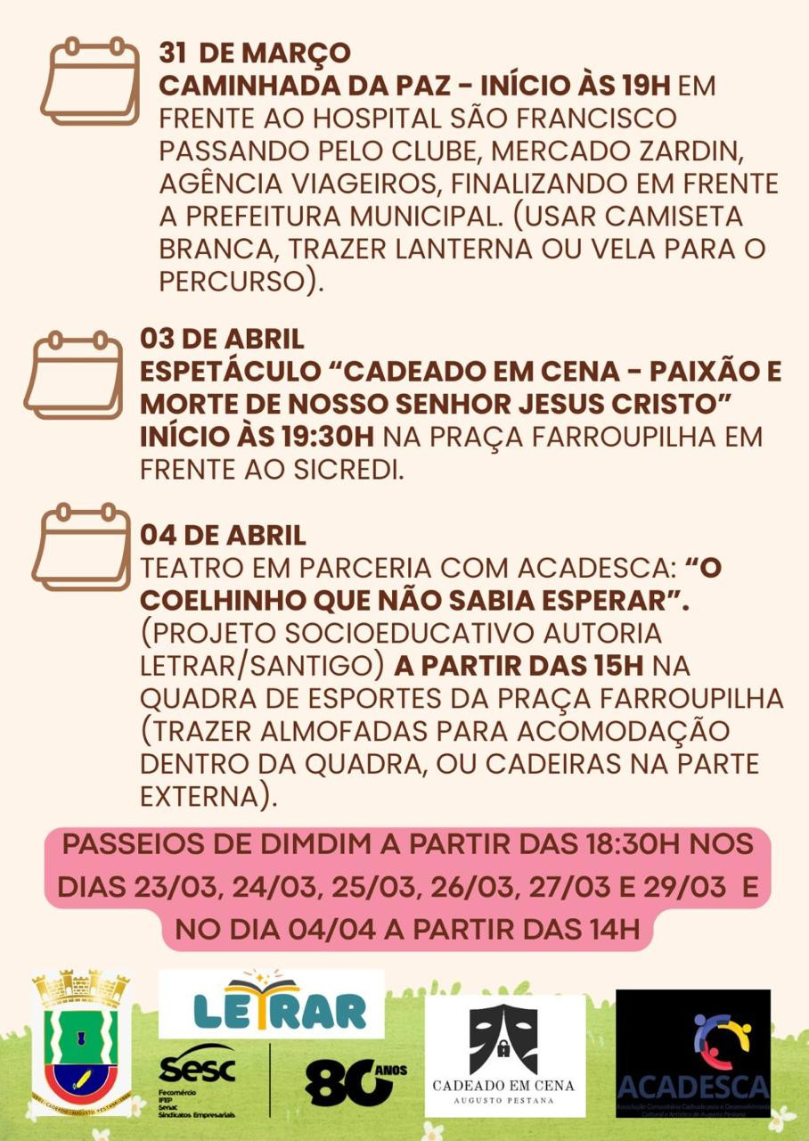 PROGRAMAÇÃO DE PÁSCOA EM AUGUSTO PESTANA 60 ANOS Prefeitura 21/03/2026 18:11 | Atualizado há 22 horas atrás PROGRAMAÇÃO DE PÁSCOA EM AUGUSTO PESTANA 60 ANOS (Foto: Reprodução)