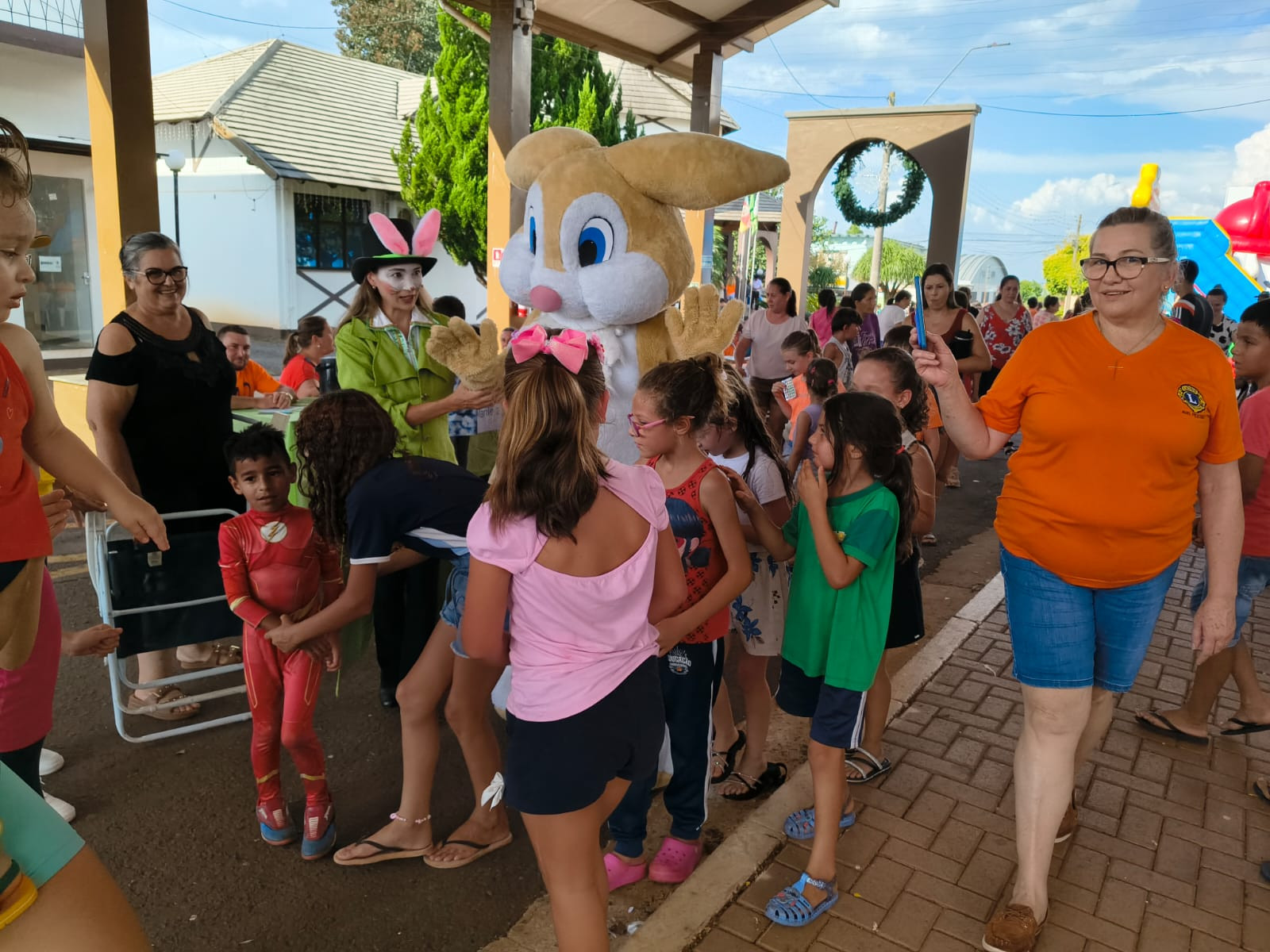 Foi uma tarde pensada com muita dedicação e carinho para as nossas crianças, com brinquedos infláveis, presença do coelho e sua ajudante, passeios de dim dim, pintura de rosto, entrega de lanches e chocolates.