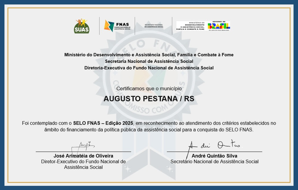 O município de Augusto Pestana - RS conquistou o Selo FNAS - Edição 2025, concedido Ministério de desenvolvimento através do Fundo Nacional de Assistência Social . O Selo FNAS (Fundo Nacional de Assistência Social) é uma certificação federal criada para reconhecer municípios e estados brasileiros que demonstram excelência e responsabilidade na gestão, aplicação e execução financeira dos recursos da Assistência Social