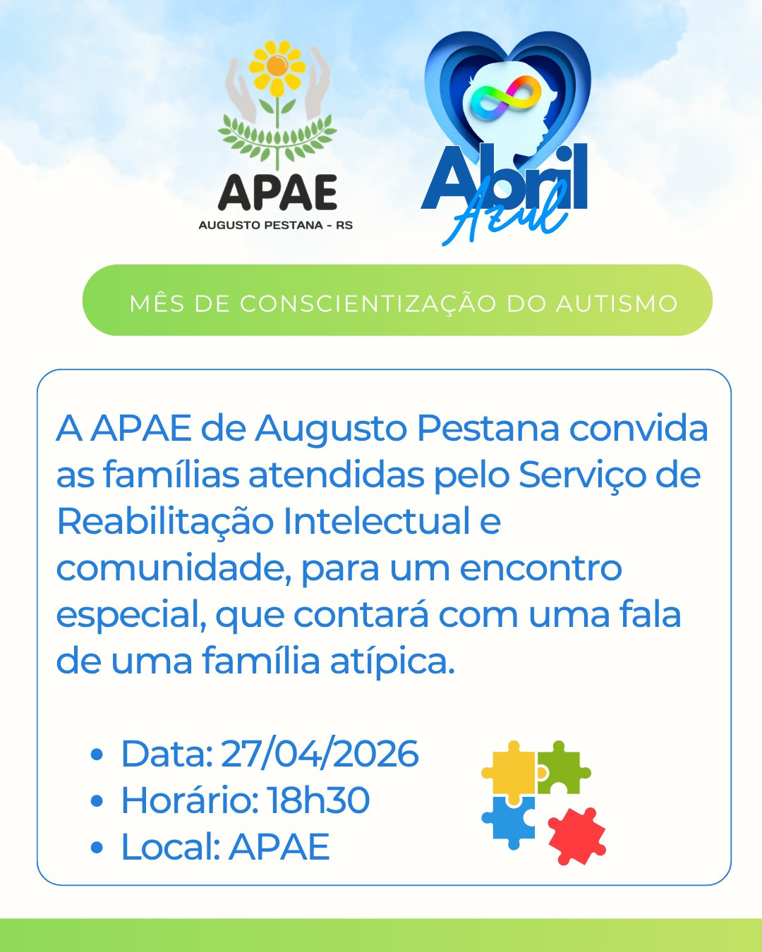A APAE de Augusto Pestana convida as famílias atendidas pelo serviço de reabilitação intelectual e comunidade para um encontro especial.