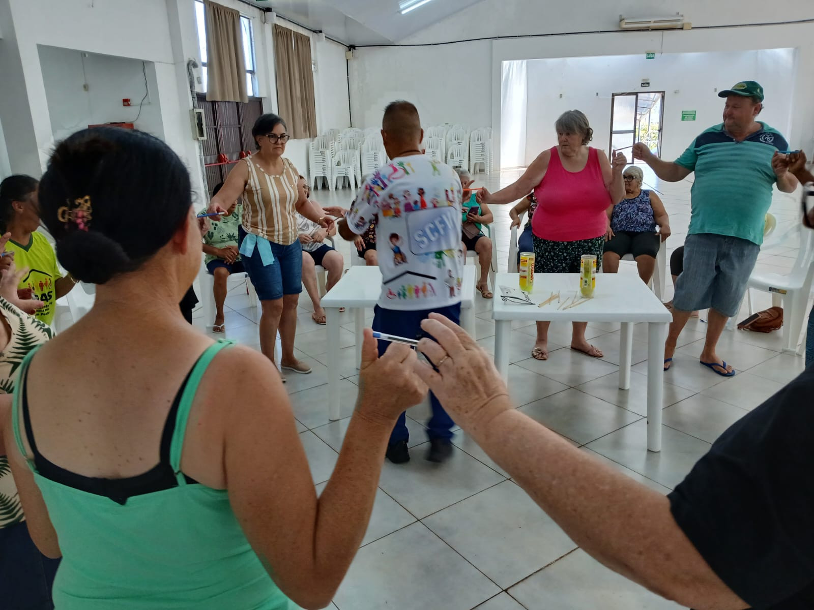 As atividades ocorreram no Centro de Convivência em dois momentos, atendendo crianças, adolescentes, adultos e idosos participantes dos grupos da cidade.