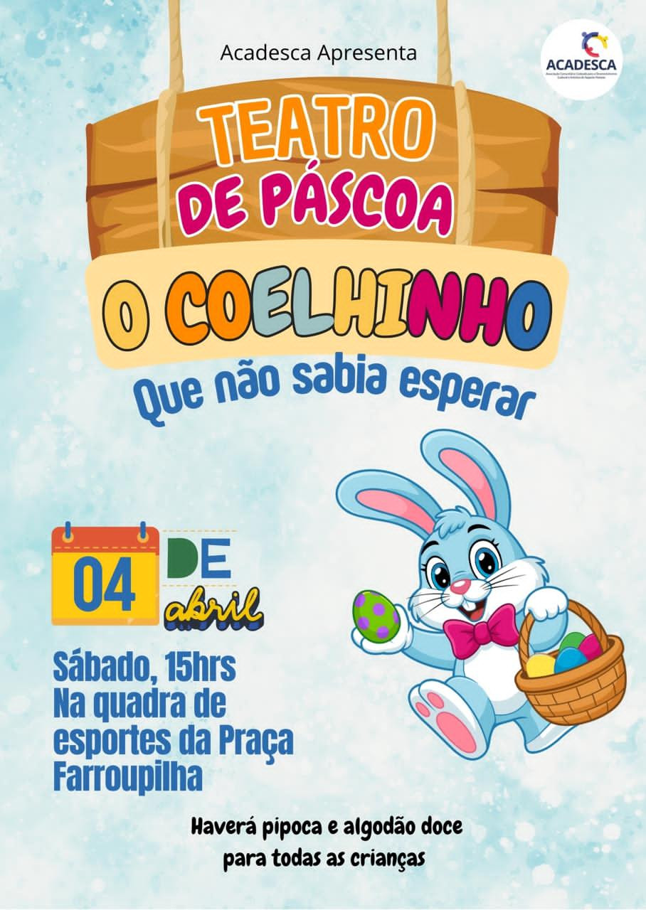 ACADESCA PROMOVE TEATRO DE PÁSCOA PARA AS CRIANÇAS ACADESCA 11/03/2026 15:32 | Atualizado há 3 horas atrás ACADESCA PROMOVE TEATRO DE PÁSCOA PARA AS CRIANÇAS (Foto: Reprodução)