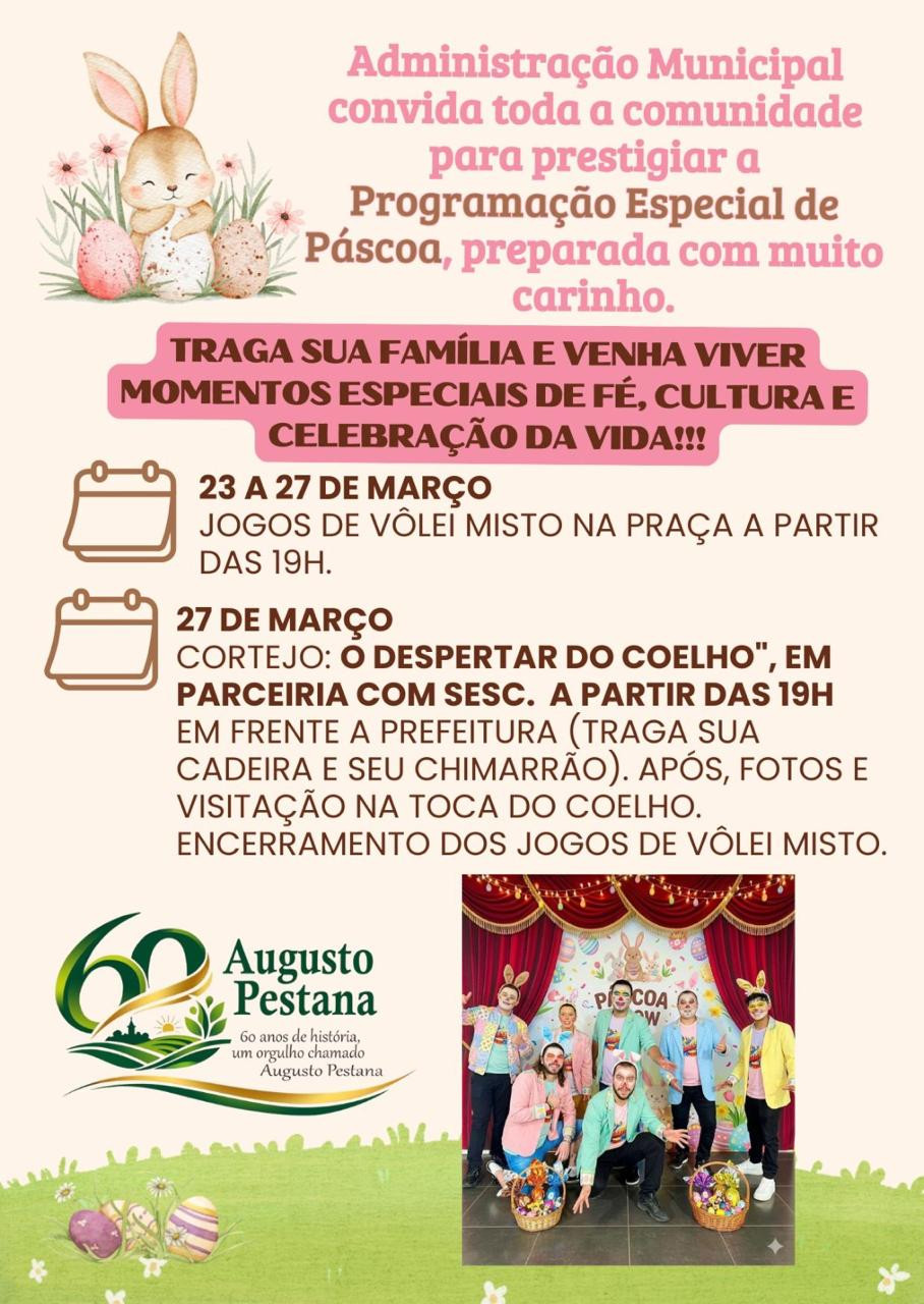 PROGRAMAÇÃO DE PÁSCOA EM AUGUSTO PESTANA 60 ANOS Prefeitura 21/03/2026 18:11 | Atualizado há 22 horas atrás PROGRAMAÇÃO DE PÁSCOA EM AUGUSTO PESTANA 60 ANOS (Foto: Reprodução)
