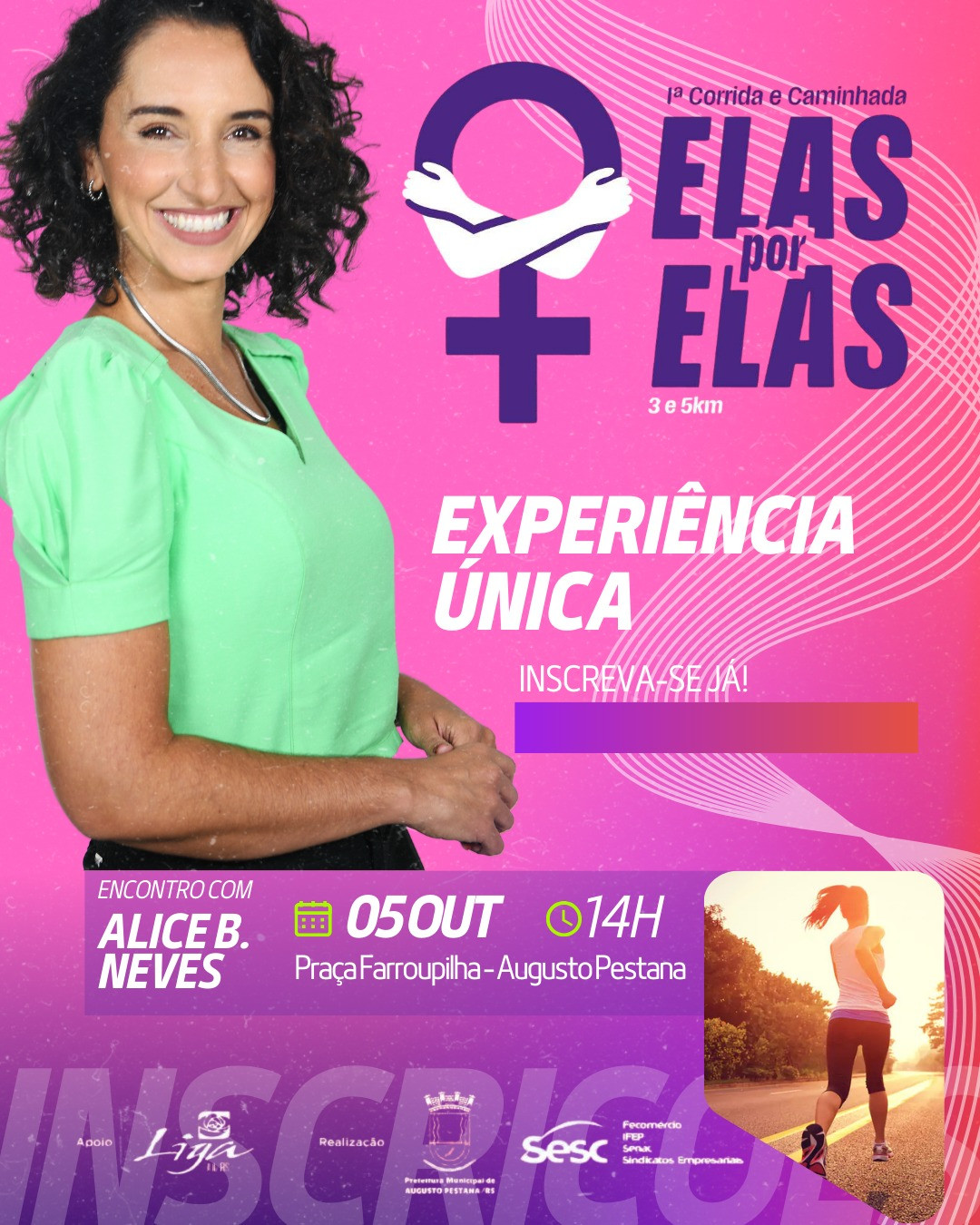 A Prefeitura de Augusto Pestana, em parceria com o Setor de Esportes, a Secretaria Municipal de Saúde e o SESC, realiza no próximo domingo, 05 de outubro de 2025, a 1ª Corrida e Caminhada “Elas por Elas”, dentro da programação do Outubro Rosa, campanha internacional de conscientização sobre a prevenção e o diagnóstico precoce do câncer de mama. O evento terá início às 14h e promete reunir a comunidade em um momento de esporte, reflexão e solidariedade.