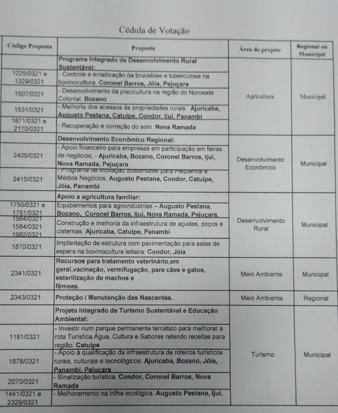 eleitores do estado do Rio Grande do Sul podem votar nesta semana até o dia 10 na consulta popular mas apenas em um projeto o pleito começou na última segunda-feira dia 6 e vai até o dia 10 o Presidente do conselho regional de desenvolvimento do noroeste colonial Nelson Tesing alerta que os municípios precisam atingir a participação mínima que é de dois por cento do eleitorado na consulta Popular para ter direito aos recursos financeiros deste processo. A votação como sabemos é voluntária os eleitores votam em demandas para receber recursos financeiros do Governo Estadual no próximo ano (2026) a votação ocorre pelo site da consulta popular no consulta popular.s.gov.br ou ainda pelo WhatsApp 51 32 10 32 60 O CORERE/NORC com sede na cidade de Ijuí abrange 11 municípios possui seis projetos e tem direito 1 milhão 885 mil reais os três projetos mais votados vão receber dinheiro os projetos do Cored noroeste colonial na consulta Popular podem ser consultadas abaixo na cédula.